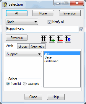 Nodes may be chosen using the node attributes (object) support, finite element, panel, solid, bar, compatibility, rigid link and emitter. They are selected in the right part of the dialog.