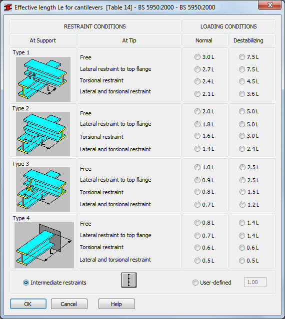 The option is used to determine appropriate distances between member cross-sections protected against torsion, i.e. to determine so-called: effective length - for a cantilever. The option is accessible after pressing one of the buttons: Upper flange or Lower flange provided in the Lateral buckling parameters field of the Member Definition - Parameters dialog box.