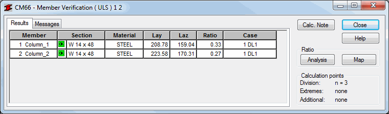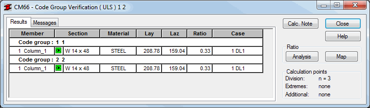 Once calculations have been performed a dialog displays simplified results for the selected type of verification.
