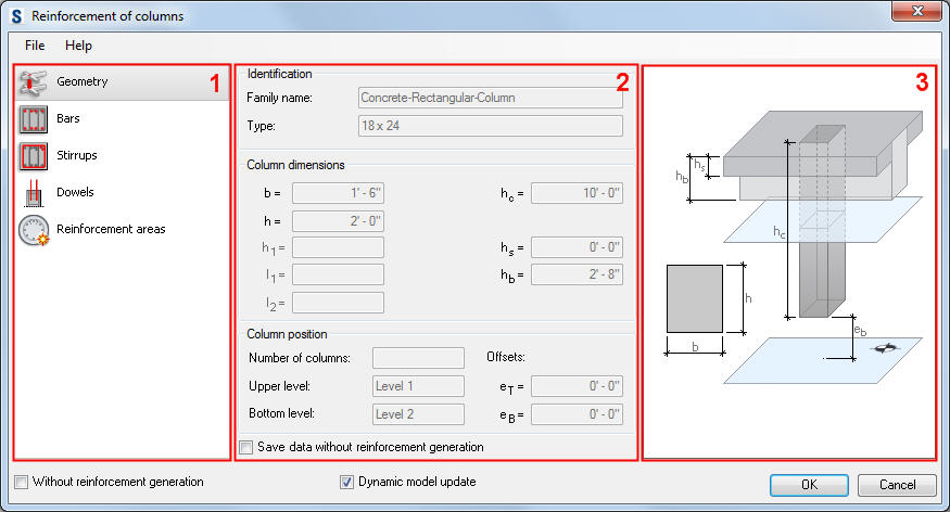 The dialog for generation of column reinforcement has 3 main parts: