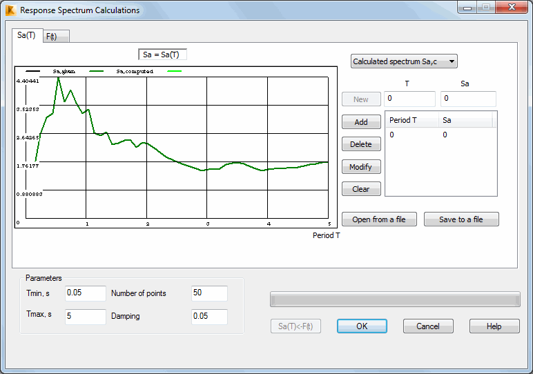 In order to define a new function, click New. Add, Delete and Modify edit a selected line in the table containing columns Period T and Sa. Click Clear to delete all spectra.