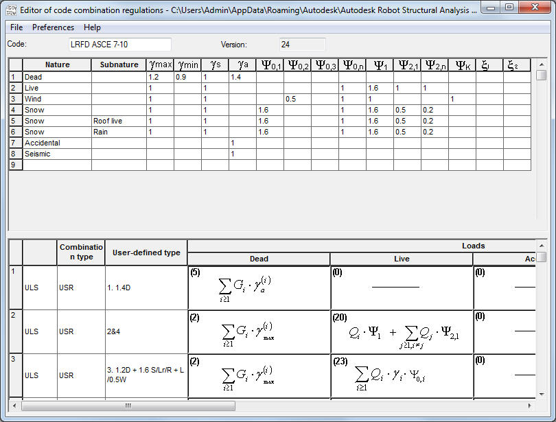 After the factor values or combination formulas of regulations were modified, the edited *.rgl regulation file may be saved by selecting File > Save. The file is saved by default in the user's data folder (...\ Users \ your_login \ AppData \ Roaming \ Autodesk \ Structural \ Common Data \ version_number \...).