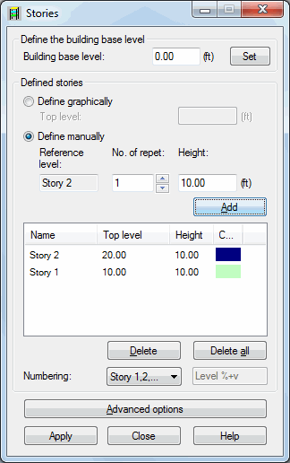 At the top of the dialog define the building base level. Clicking Set completes the definition.