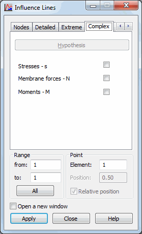 The options in the dialog box let you indicate a surface-related quantity (defined for a plate or shell structure) for which the influence lines are presented: