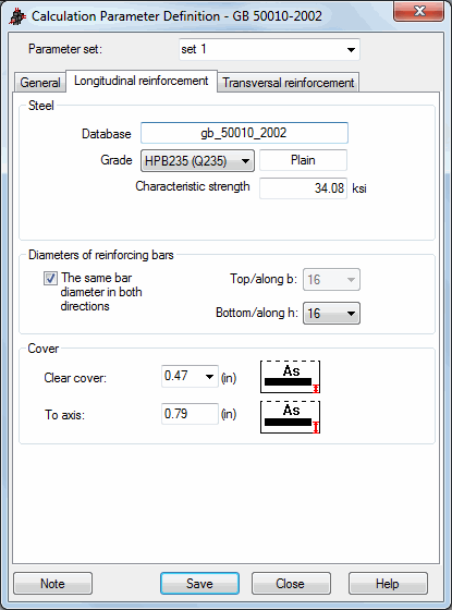 Below, diameters of bars for reinforcement of an element are determined. The bars are listed in metric diameter units for top/bottom reinforcement. Bar diameters can be different for top and bottom reinforcement of a beam. Similarly, a column can have reinforcement along h and b sides. If the same diameters are used for the entire element, The same type of reinforcement in both directions option should be selected.