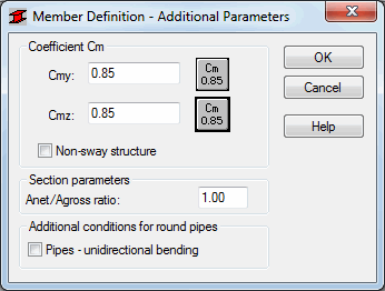 Using this option, you can define additional code parameters for the steel bar type. Access the option by clicking the More button in the Member Definition - Parameters dialog. After the option is selected, the following dialog displays: