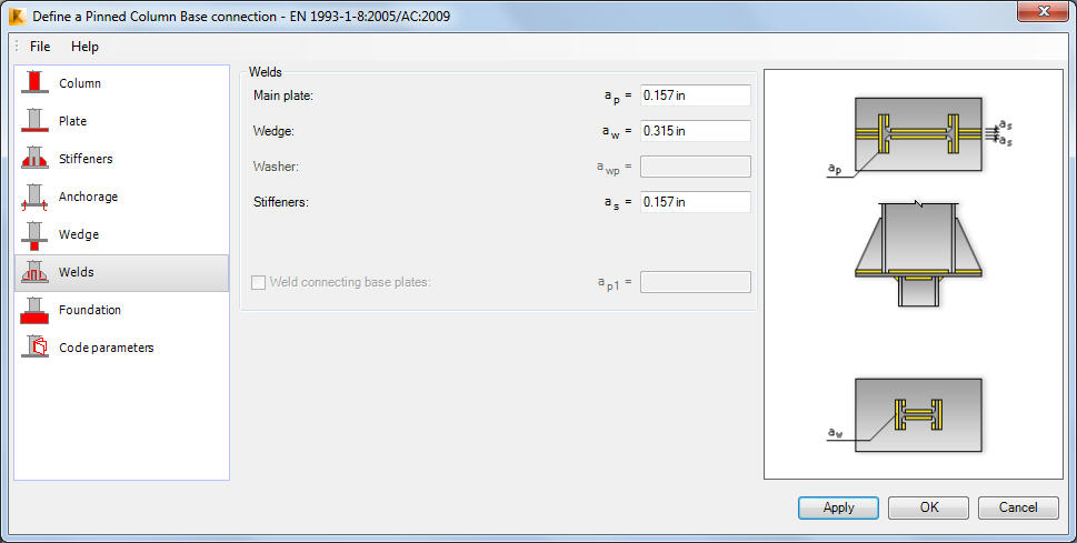 Use the Welds tab to define welds connecting individual elements of the column base (such as main plate, wedge, washer or stiffeners).