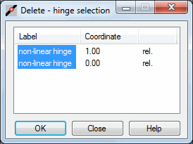 - If more hinges are defined on the bar, the Delete - hinge selection dialog (see the following image) opens. After selecting a hinge in the dialog, the hinge is deleted from the selected bar.