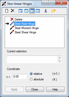 Similar to the dialogs used for defining other structure attributes, the process of defining a hinge in a structure has 2 steps: