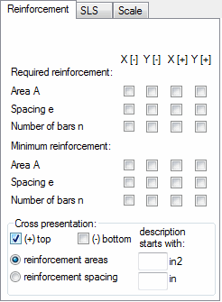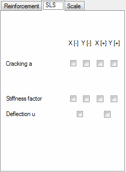 Note: The listed quantities are calculated if the calculation of cracking and deflection for the plate and shell reinforcement type used in the structure is selected. This is found on the SLS parameters tab in the