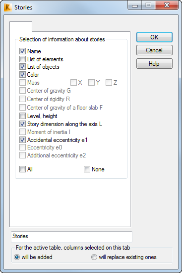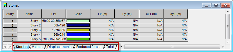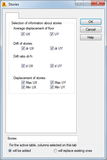 Note: The content of the Stories dialog depends on which tab is selected in the Stories table (Stories, Values, Displacements, Reduced forces, Total).