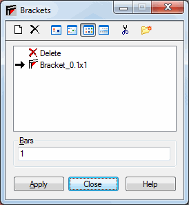 The Brackets dialog lets you directly assign bracket properties to structure elements. It has an active list field, active selection field, and the standard buttons (Apply, Close, and Help). Information about the label and the type of the defined bracket is in the active list field.