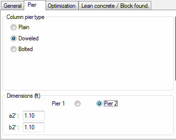 If the Spread footing with two columns option is selected on the General tab, the contents of the Dimensions field changes. You can then determine the geometrical dimensions of a column/footing connection for each of the piers separately. The pier type is always the same for each of the piers.