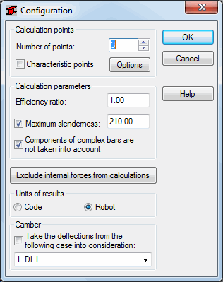 Use the Configuration dialog to define the parameters applied during the verification of a steel member. Access the dialog by clicking the Configuration button in the Calculations dialog. The following dialog displays: