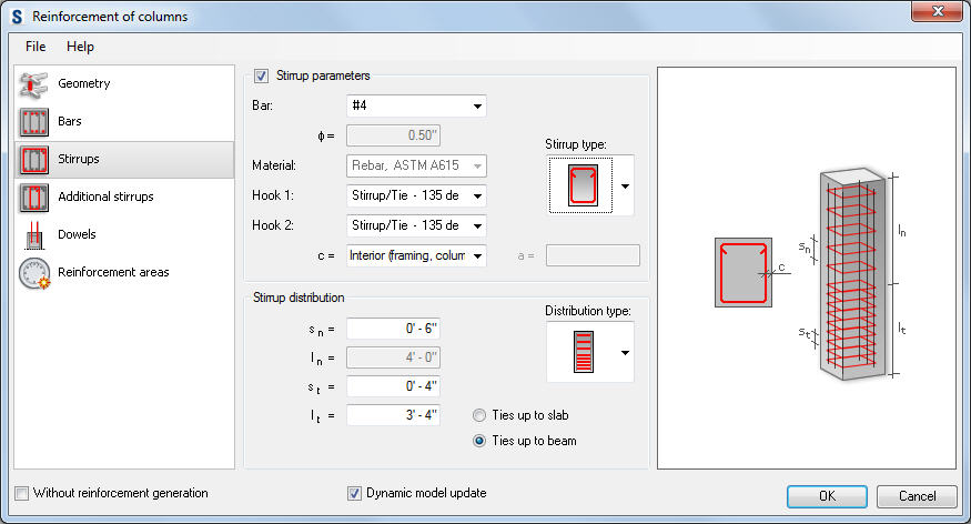 There are several parameters of transversal reinforcement (stirrups) defined in the Reinforcement of columns dialog:
