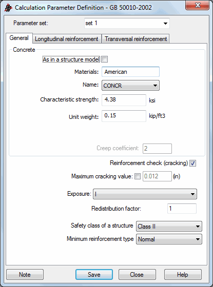 The General tab of the Calculation Parameter Definition dialog box for the Chinese code GB 50010-2002: