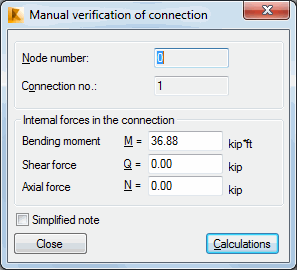 After clicking the Calculations button the software runs calculations of the selected connection type for a given structure node. Define internal connection forces (M, Q, N).