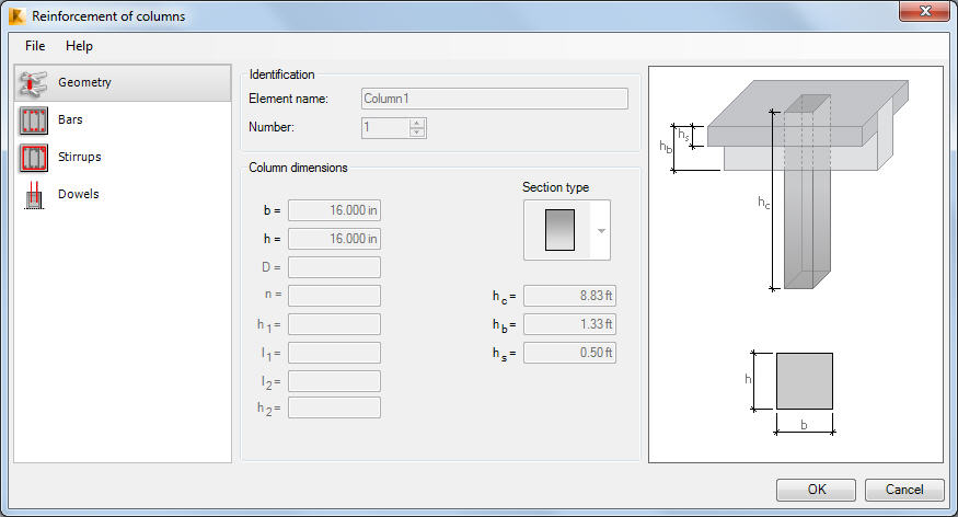 It is possible to define other types of column sections (e.g. Z-section, half-circle section etc.) but the column reinforcement is not generated for these section types.