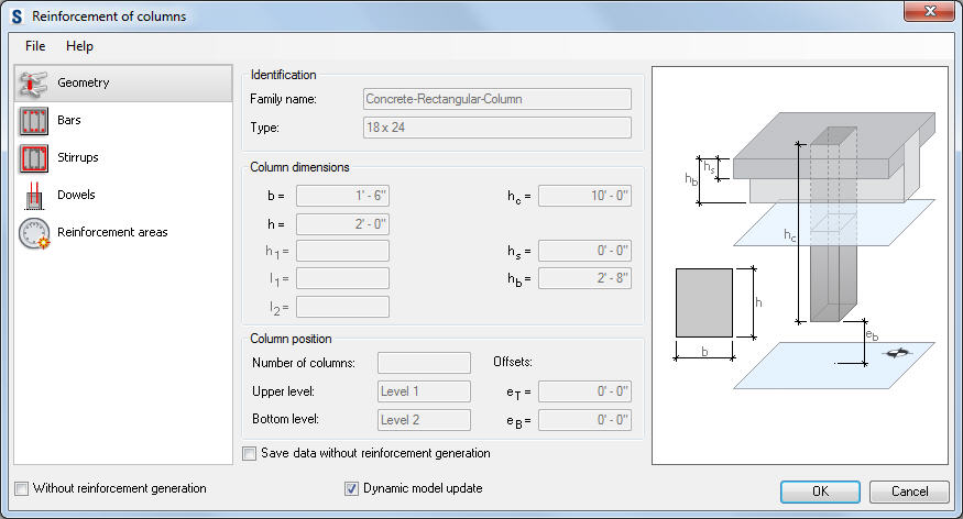 If the Save data without reinforcement generation option is cleared, the reinforcing bars are generated and displayed in Autodesk® Revit®. If this option is selected, the reinforcement data is generated (and can be used after restarting the Extension), but reinforcing bars cannot be displayed in Autodesk® Revit®.