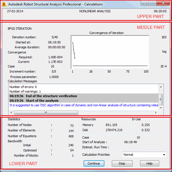 - The middle section depends on the selected analysis type and a solver (chosen in the Job preferences dialog from the Structural Analysis tab). This section displays information regarding individual stages of structure calculations and indicates the current analysis stage.