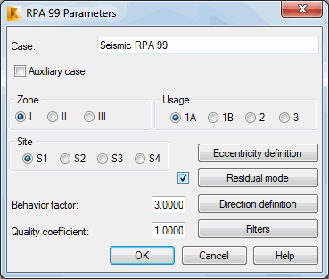 Parameters of a structure seismic analysis depend on a seismic code used during calculations of a structure influenced by seismic impact. Select Algerian seismic code RPA 99 or RPA 99 (2003) in the New Case Definition dialog or click Parameters in the Analysis Type dialog.
