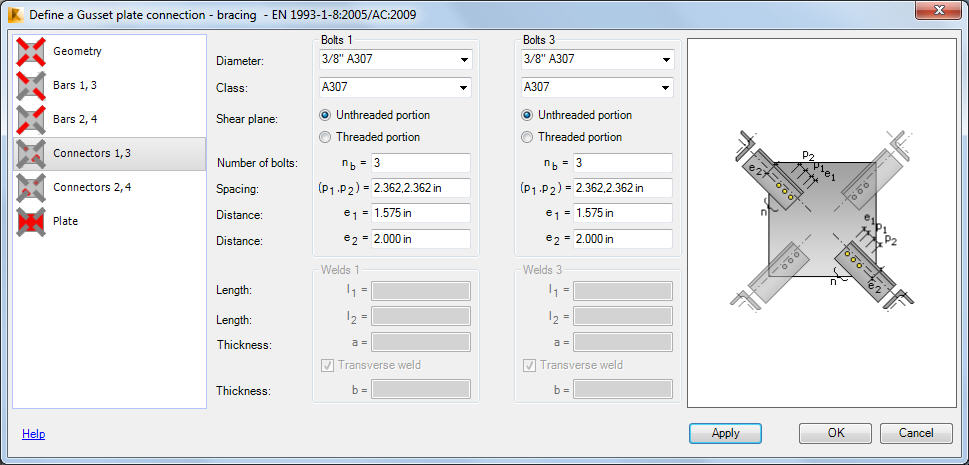 - parameters of welds used to connect the bar with the gusset plate (if a welded connection is selected for this bar).