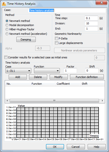 Note: The modal decomposition method does not take into account loads in the form of a forced displacement, velocity, or acceleration of supports. If you want to include these loads in the time history analysis, you must select either the Hilber-Hughes-Taylor method or the Newmark (acceleration) method.