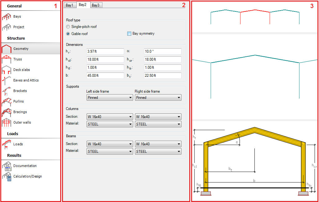 - in the right part, there is the graphic viewer divided in three parts where the defined elements of the frame structure are presented.