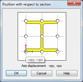 The Position with Respect to Section dialog is used to define automatic offsets for structure bars. An offset is determined by a shift of a bar axis to the to the extreme dimension of the section. Open the dialog box by clicking Section position (or Axis offset) in the New Offset dialog.