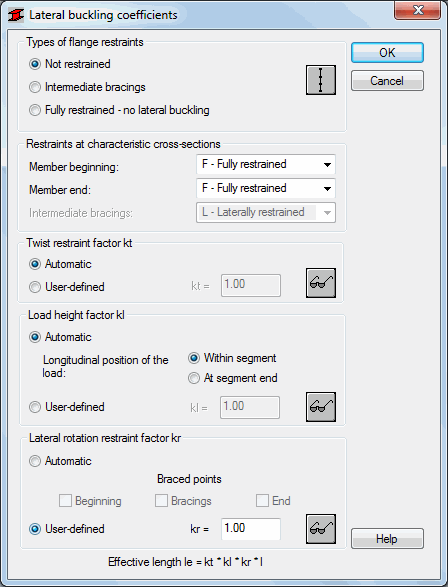 The selection lists (for the member beginning and end, and for intermediate bracings) in this field allow you to define a restraint type at these characteristic points; Based on selected values, Robot determines values of the kr, kl and kt coefficients following the recommendations in the tables 5.6.3.(1), 5.6.3.(2) and 5.6.3.(3) of the code