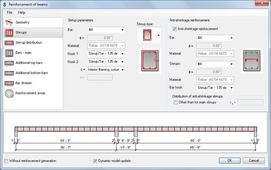 There are several parameters of transversal reinforcement (stirrups) defined in the Reinforcement of beams dialog: