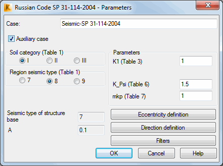 Parameters of a structure seismic analysis depend on a seismic code used during calculations of a structure influenced by seismic impact. Select Russian seismic code (SP 31-114 2004) in the New Case Definition dialog or click Parameters in the Analysis Type dialog.