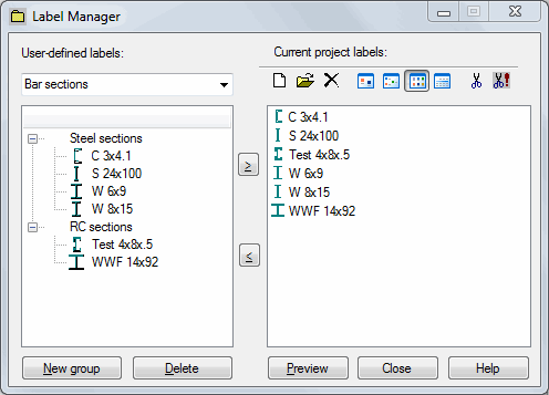 The Label Manager stores a library of labels for structure elements, such as, supports, releases, sections, and code parameters. In this library, you can save a user-defined label so you can use it in other structure projects.
