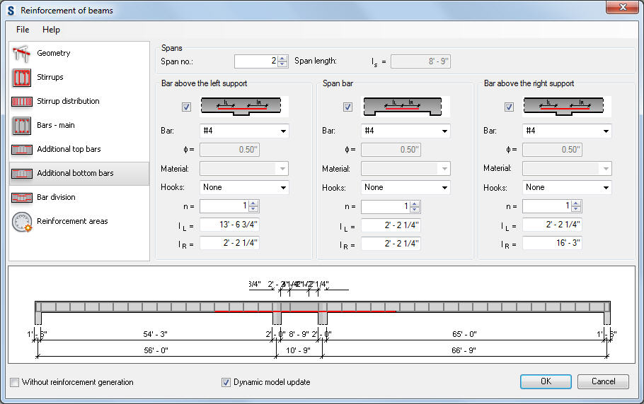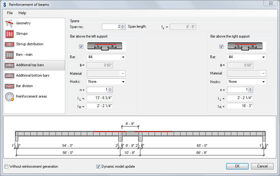 Reinforcing bars are generated separately for each beam span. Parameters of these additional top bars include: