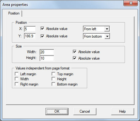 The Position tab contains the same options as the corresponding tab in the Text properties dialog box. Additionally, you can determine the size of the view and indicate which values are to be independent from page format (in the default configuration, all the values are recalculated proportionately by the Robot printout module when page format is modified).