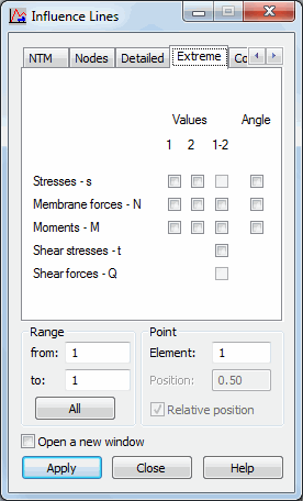 The options in the dialog let you indicate a surface-related quantity (defined for a plate or shell structure) for which the influence lines are presented: