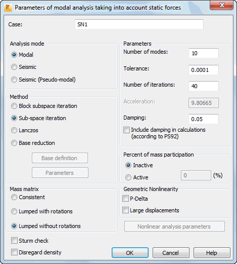 The Parameters of modal analysis recognizing static forces dialog is defines the parameters of modal analysis. This takes into account the operation of static forces from either the selected static load case, or from load combinations.