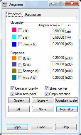 On the Properties tab in the Diagrams (thin-walled section) dialog, you can select thin-walled section properties for which diagrams are to be presented.