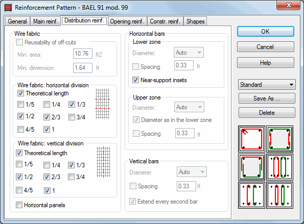 This tab is divided into two parts. The first refers to wire fabric, the second to reinforcing bars. Depending on the selection of distributed reinforcement type on the General tab of the Distributed reinforcement field, only one type of distributed reinforcement is active in the Distributed reinforcement tab.