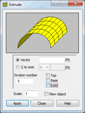 The option creates simple planar or solid-like elements by extruding predefined 2-dimensional objects. The option is available using one of the following methods: