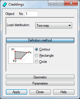 Definition method selects a method of defining a cladding (Contour, Rectangle or Circle); selecting one of these options determines the definition method.