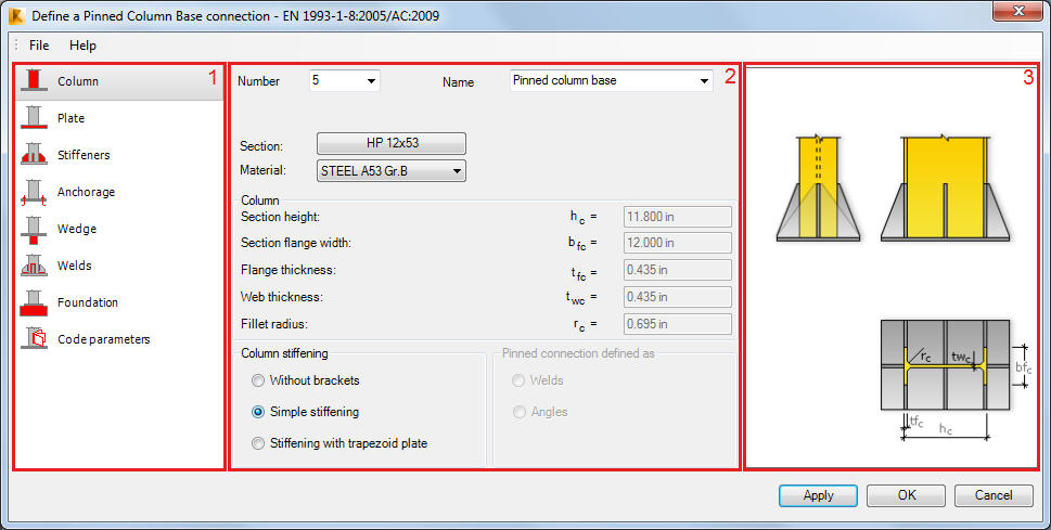 - In the center, you can define parameters of a selected element of the steel connection.