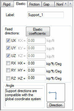 For an elastic support, specify either the blocked degrees of freedom or the coefficients of elasticity in the appropriate directions: