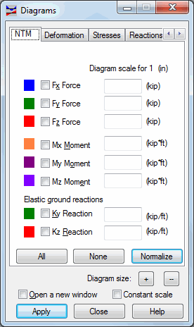 - Moments: MX, MY and MZ (when one of these options is selected, the MX, MY or MZ moment diagram displays) .