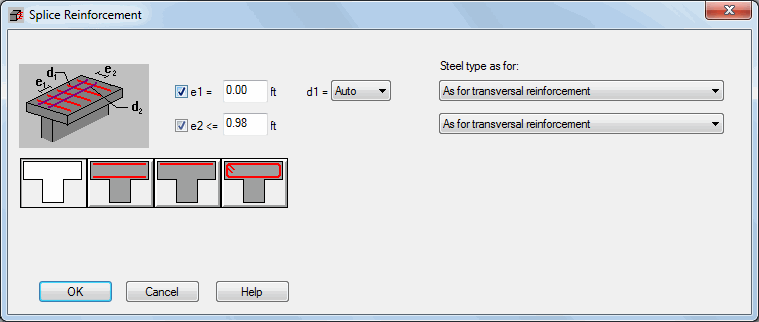Pressing the Splice reinforcement button in the Reinforcement pattern dialog box (Structural reinforcement tab) results in displaying the dialog box shown below.