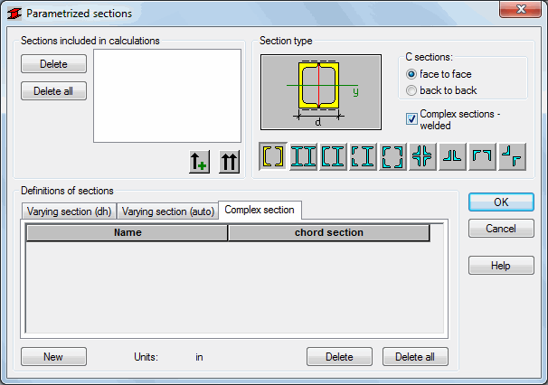 The above dialogs defines the generation procedure for new families of complex sections. The actual generation of sections takes place in the process of member group design with the use of defined parameterized families.