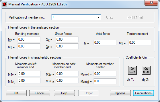 The Manual Verification dialog is used for manually verifying a steel member for values defined by the user according to the requirements of the American Steel Code ASD. Bar verifications are performed by assigning the force values appropriate for specific calculations. The dialog is divided into two main parts: