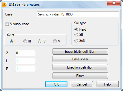 Parameters of a structure seismic analysis depend on a seismic code used during calculations of a structure influenced by seismic impact. Select Indian seismic code (IS 1893) in the New Case Definition dialog or click Parameters in the Analysis Type dialog.