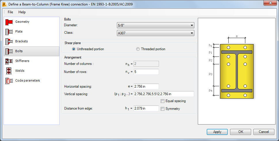 Use the Bolts tab to define bolts connecting the column flange with the front plate.
