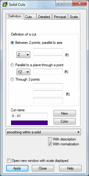 This tab defines solid cuts made by means of a plane. Operation and contents of the tab for cut definition is analogical as cut definition for shell structures.